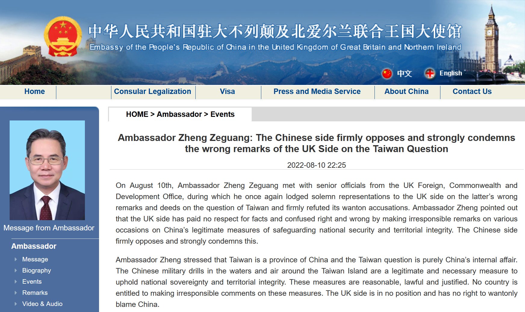 O embaixador chinês no Reino Unido, Zheng Zeguang, ofereceu a posição de seu governo sobre a disputa territorial, declarando que Taiwan se tornou uma “questão de pedra de toque” para a China, os EUA e o Reino Unido.