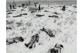 No Massacre de Wounded Knee, quase trezentos nativos norte-americanos, incluindo idosos, mulheres e crianças , da tribo Lakota (parte da confederação dos povos siouxs) foram mortos por soldados do exército dos Estados Unidos . O massacre, chamado vergonhosamente pelo exército norte-americano de "batalha", ocorreu em 29 de dezembro de 1890, perto do riacho conhecido como Joelho Ferido na Reserva Indígena Lakota Pine Ridge, em Dakota do Sul , após uma tentativa frustrada dos soldados da União de desarmar o acampamento Lakota. Até hoje há um monumento no local, "celebrando" o feito.