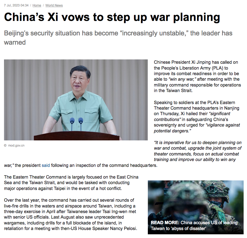 Falando aos soldados na sede do Comando do Teatro do Leste do PLA em Nanjing na quinta-feira, dia 6 de julho, Xi elogiou suas “contribuições significativas” na salvaguarda da soberania da China e pediu “vigilância contra perigos potenciais”.