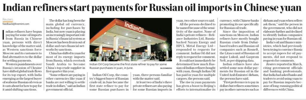 “Algumas refinarias estão pagando em outras moedas, como o yuan, se os bancos não estiverem dispostos a negociar em dólares”, disse uma fonte anônima do governo indiano.