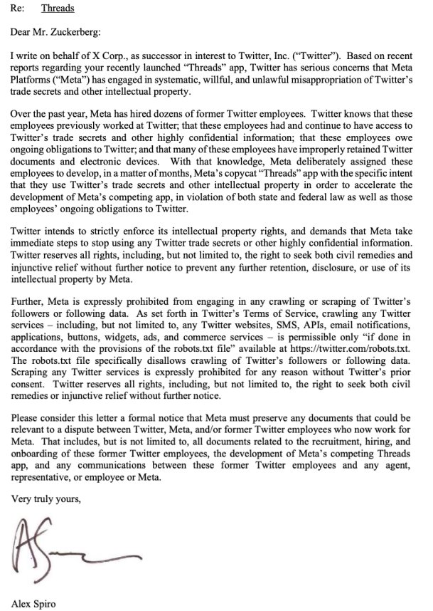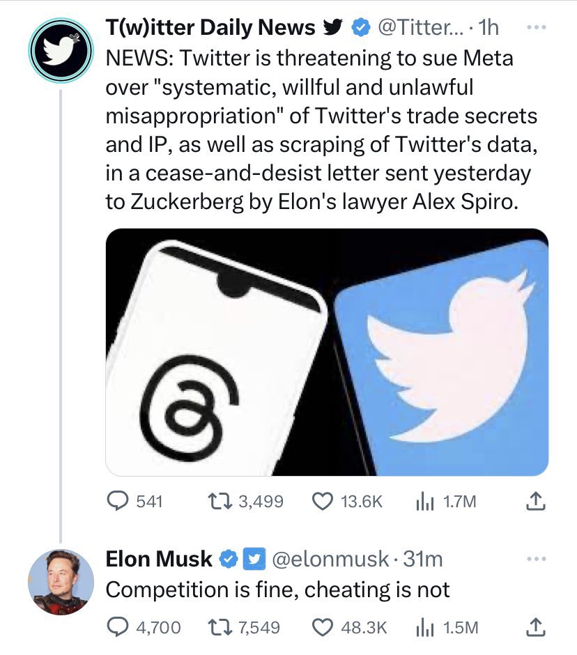 “O Twitter quer fazer cumprir rigorosamente seus direitos de propriedade intelectual e exige que a Meta tome medidas imediatas para parar de usar quaisquer segredos comerciais do Twitter ou outras informações altamente confidenciais”, escreveu Spiro.
