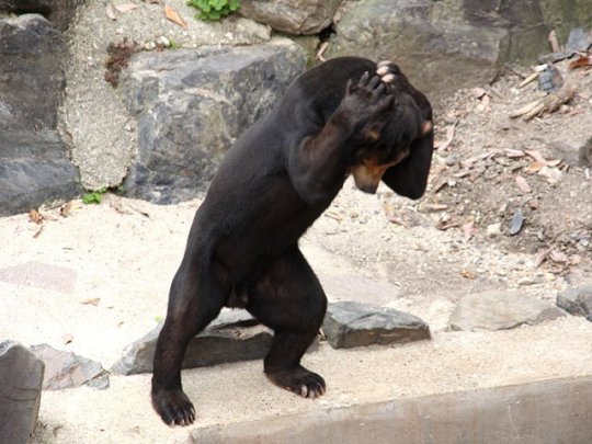 “Algumas pessoas pensaram que a maneira como me levanto parece muito humana. Parece que você não me conhece muito bem… Eu sou uma ursa-malaia! Um urso malaio não é um urso preto! Não é um cachorro!”