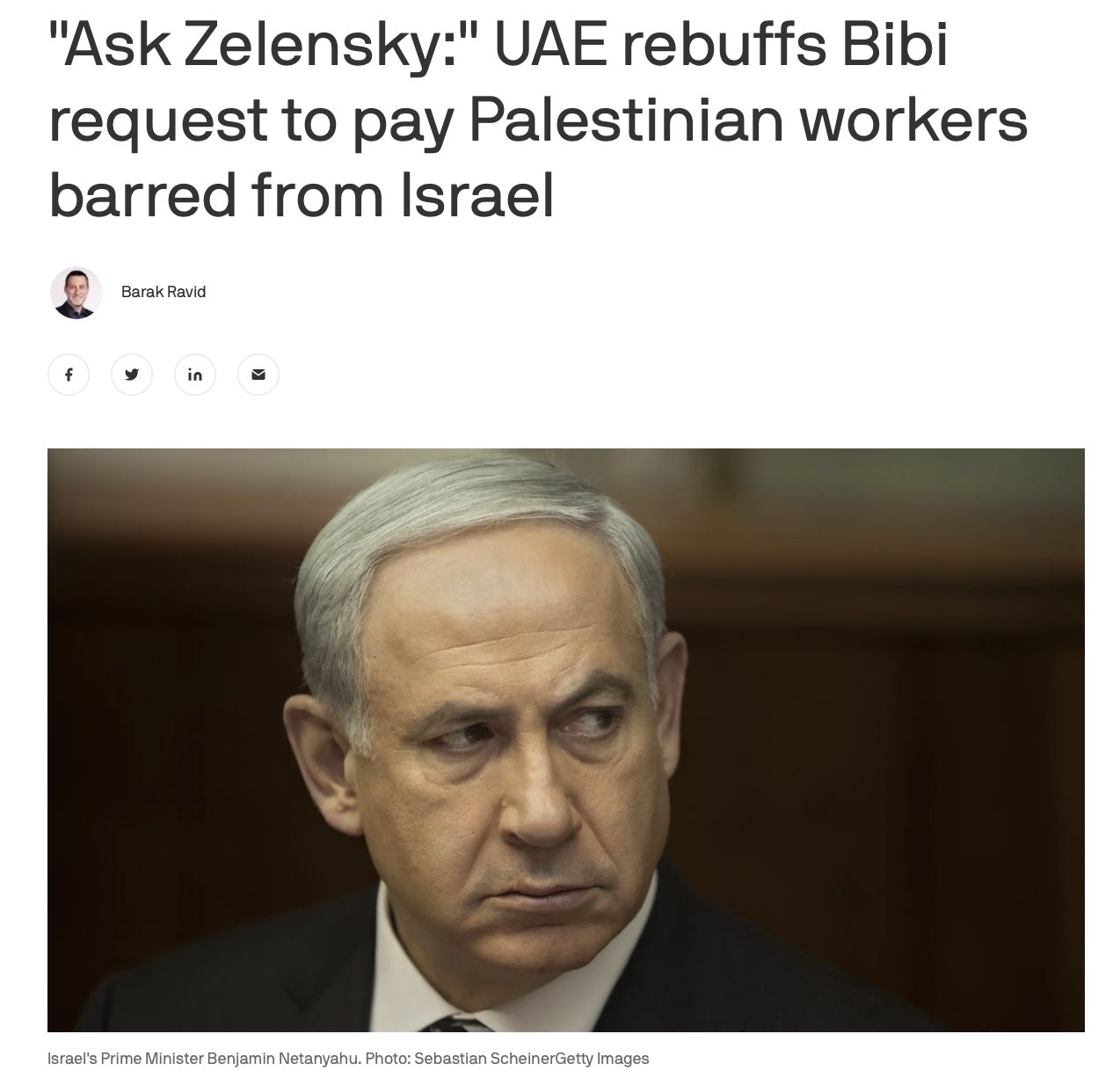 Netanyahu abordou o líder dos Emirados “há algumas semanas” e pediu-lhe que pagasse benefícios de desemprego a mais de 100.000 residentes palestinos da Cisjordânia que não podiam viajar para trabalhar em Israel desde outubro, informou Axios na segunda-feira, citando um nome não identificado. Oficial israelense e outra fonte anônima.