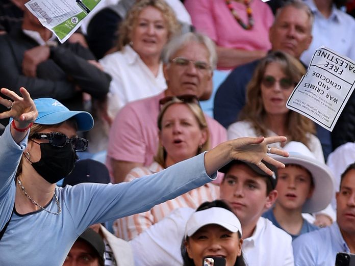 Os panfletos, que diziam “Palestina Livre”, e a sinopse acrescentavam: “Enquanto você assiste tênis, bombas estão caindo sobre Gaza” em tinta preta em páginas brancas.