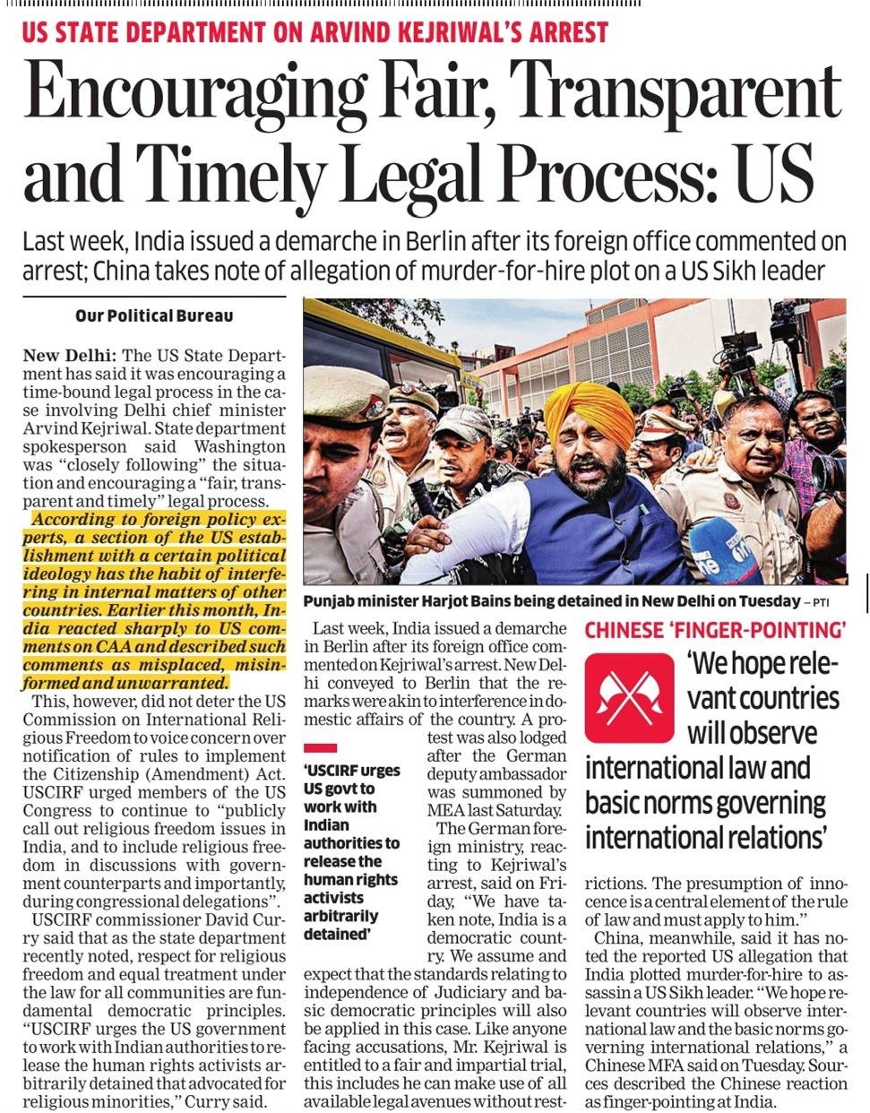 Um porta-voz do Departamento de Estado dos EUA disse na terça-feira que Washington estava “acompanhando de perto” a prisão de Kejriwal – que está sob custódia desde quinta-feira passada sob acusações de corrupção – e encorajou um processo legal “justo, transparente e oportuno”. Na quarta-feira, Nova Delhi convocou a Vice-Chefe da Missão dos EUA, Gloria Berbena, informou a mídia indiana. A reunião no gabinete do Itamaraty durou cerca de 40 minutos, segundo o canal de notícias NDTV.