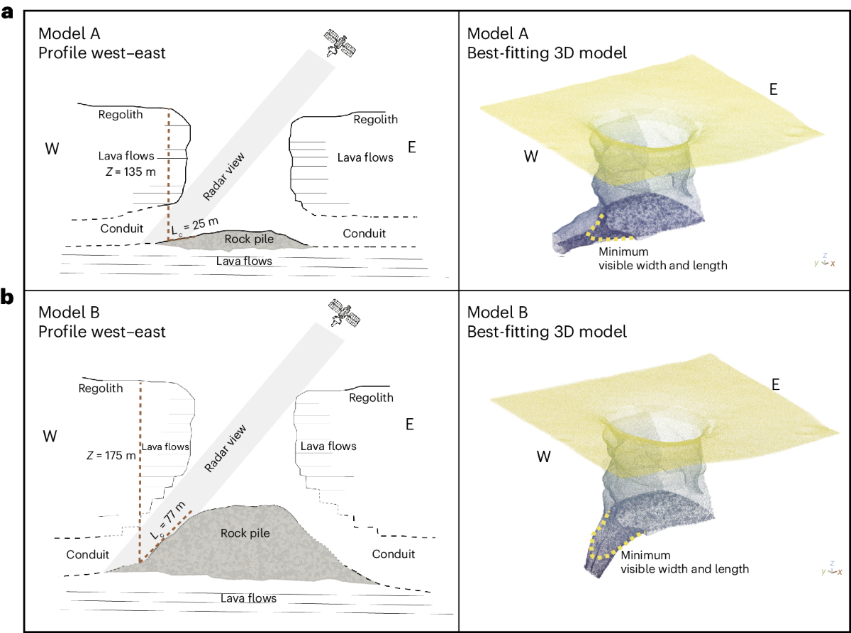 Os dados recolhidos pelo instrumento Mini-RF da LRO sugerem que pode na verdade ser uma “clarabóia” pendendo sobre o chão inclinado de uma caverna com 150 metros de profundidade, 45 metros de largura e 80 metros de comprimento, explicou Lorenzo Bruzzone, da Universidade de Trento, em Itália. para a mídia.