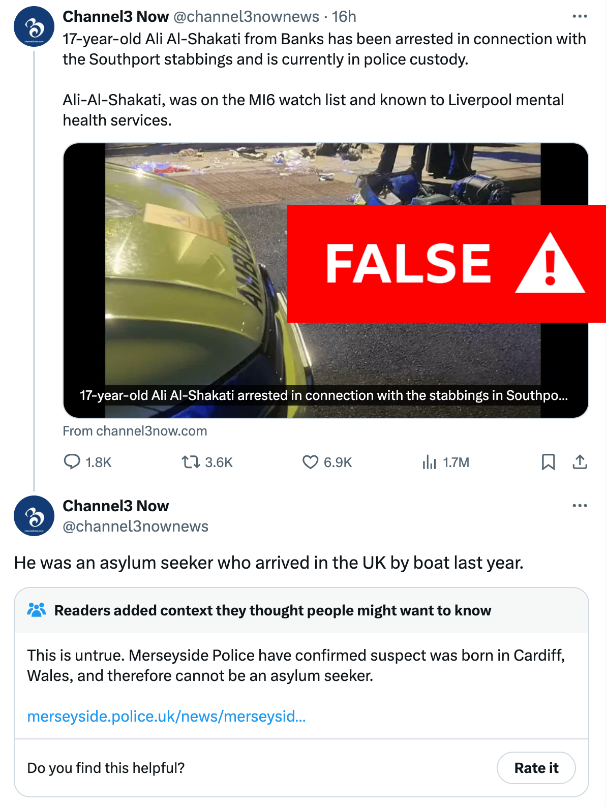 O Channel3 Now havia nomeado o suspeito como Ali-Al-Shakati, um terrorista requerente de asilo que supostamente chegou ao Reino Unido de barco no ano passado. Ele estava supostamente "na lista de observação do MI6 e era conhecido pelos serviços de saúde mental de Liverpool". O Channel3 Now — que parece se especializar em cobrir tiroteios, principalmente na América — posteriormente excluiu a alegação. O site parece ser um "agregador", que frequentemente publica alegações falsas projetadas para se tornarem virais.