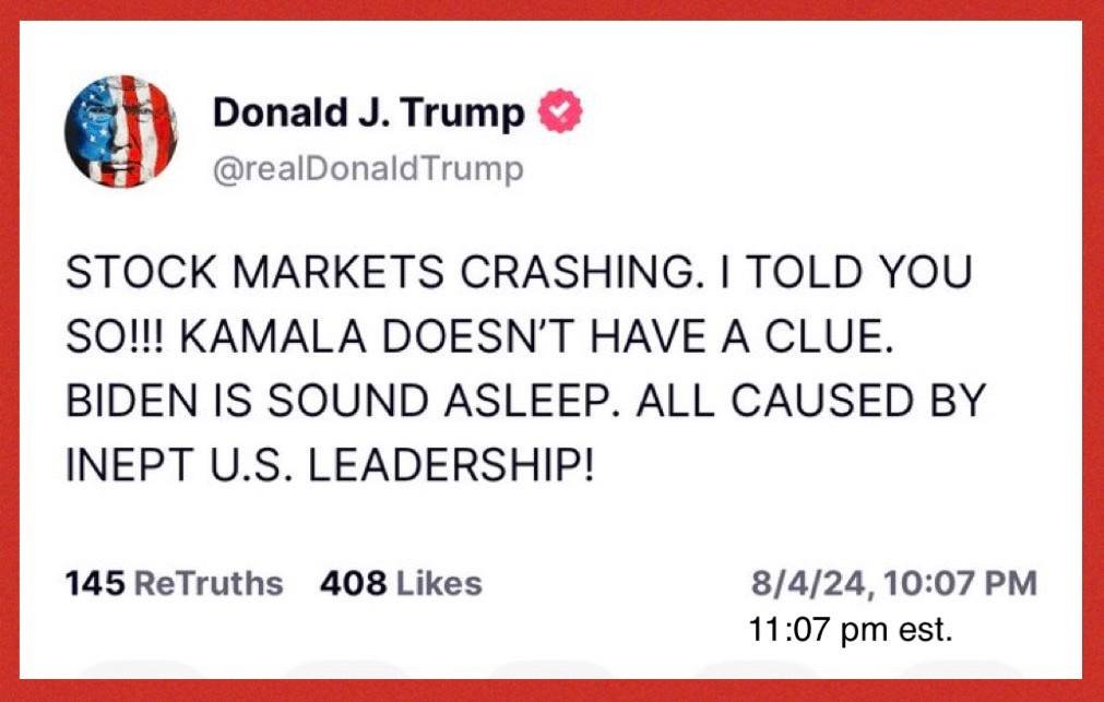 Trump fez a acusação em uma publicação nas redes sociais no domingo, escrevendo em letras maiúsculas: "MERCADOS DE AÇÕES QUEBRANDO. EU TE AVISEI!!! KAMALA NÃO TEM A MÍNIMA IDEIA. BIDEN ESTÁ DORMINDO. TUDO CAUSADO PELA LIDERANÇA INEPTA DOS EUA!"