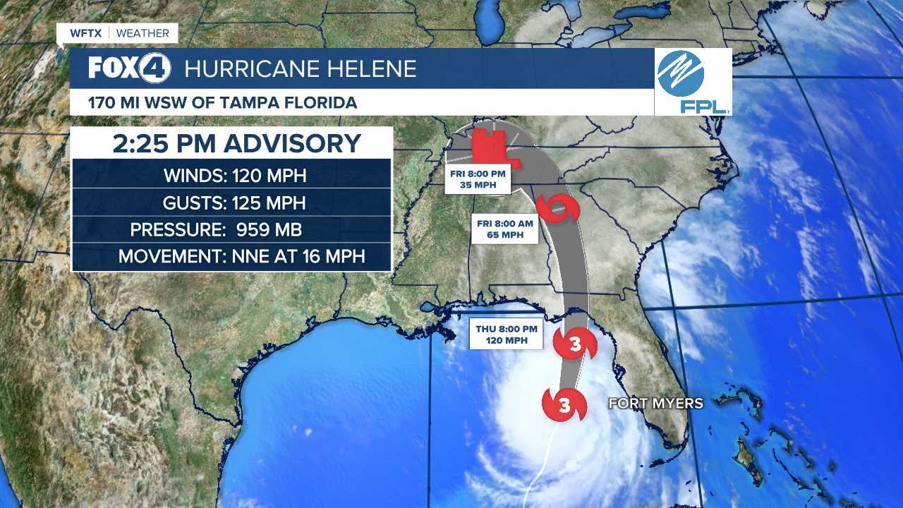 Helene estava a cerca de 515 quilômetros a sudoeste de Tampa na manhã de quinta-feira e se movia de norte a nordeste a 19 quilômetros por hora com ventos máximos sustentados de 155 quilômetros por hora. Os meteorologistas dizem que se tornará um furacão de categoria 3 ou maior, o que significa que os ventos atingirão 177 quilômetros por hora.