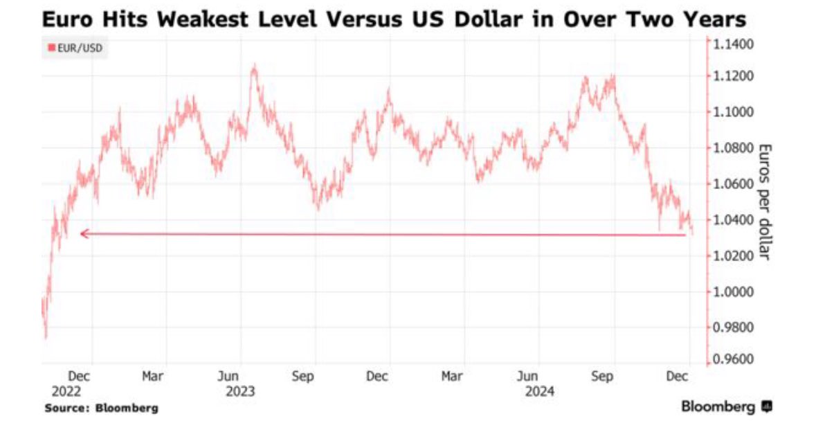 A instabilidade política também exacerbou os problemas do euro, com os governos da Alemanha e da França entrando em colapso no final do ano passado, e toda a UE se preparando para as tarifas prometidas pelo presidente eleito dos EUA, Donald Trump.